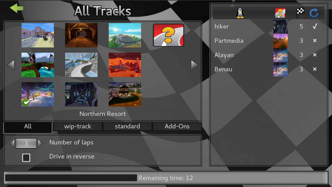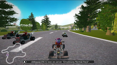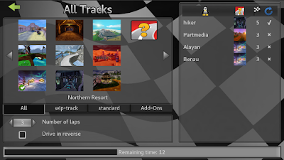 One important caveat: the network implementation is actually quite sophisticated (I might do a separate blog post about its implementation), but there are still limits in what we can do about the latency (or ping) between clients and servers. We strongly recommend to find a server with a ping of under 150ms for a smooth playing experience. The ping to the server will be shown when you connect to it. You can of course try servers with higher latency - while it should still work, you might notice more often that karts stutter, drive like drunk (though that might of course also be the skill of the other players) or are 'teleported' around. In addition you need a stable connection, so if you experience significant packet loss or jitter you will see the same strange behavior.